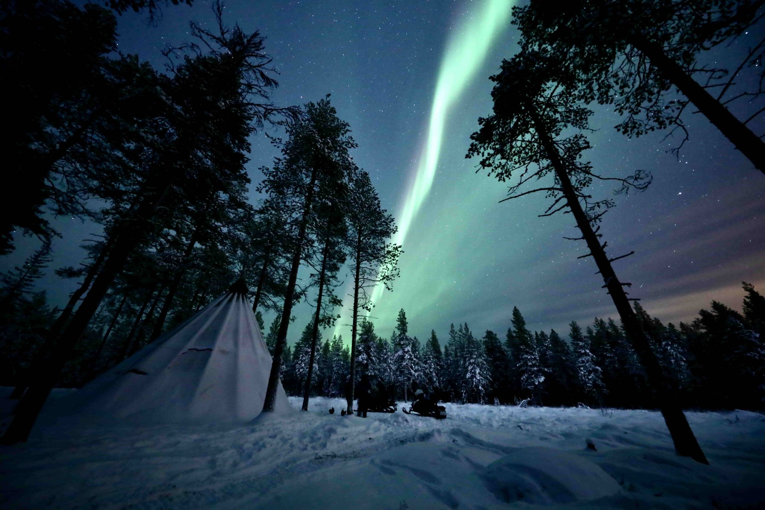 Facendo una bellissima ciaspolata di notte nella foresta Lappone, dove saremo illuminati dalla luna le stelle e se abbiamo fortuna lโAurora Boreale.